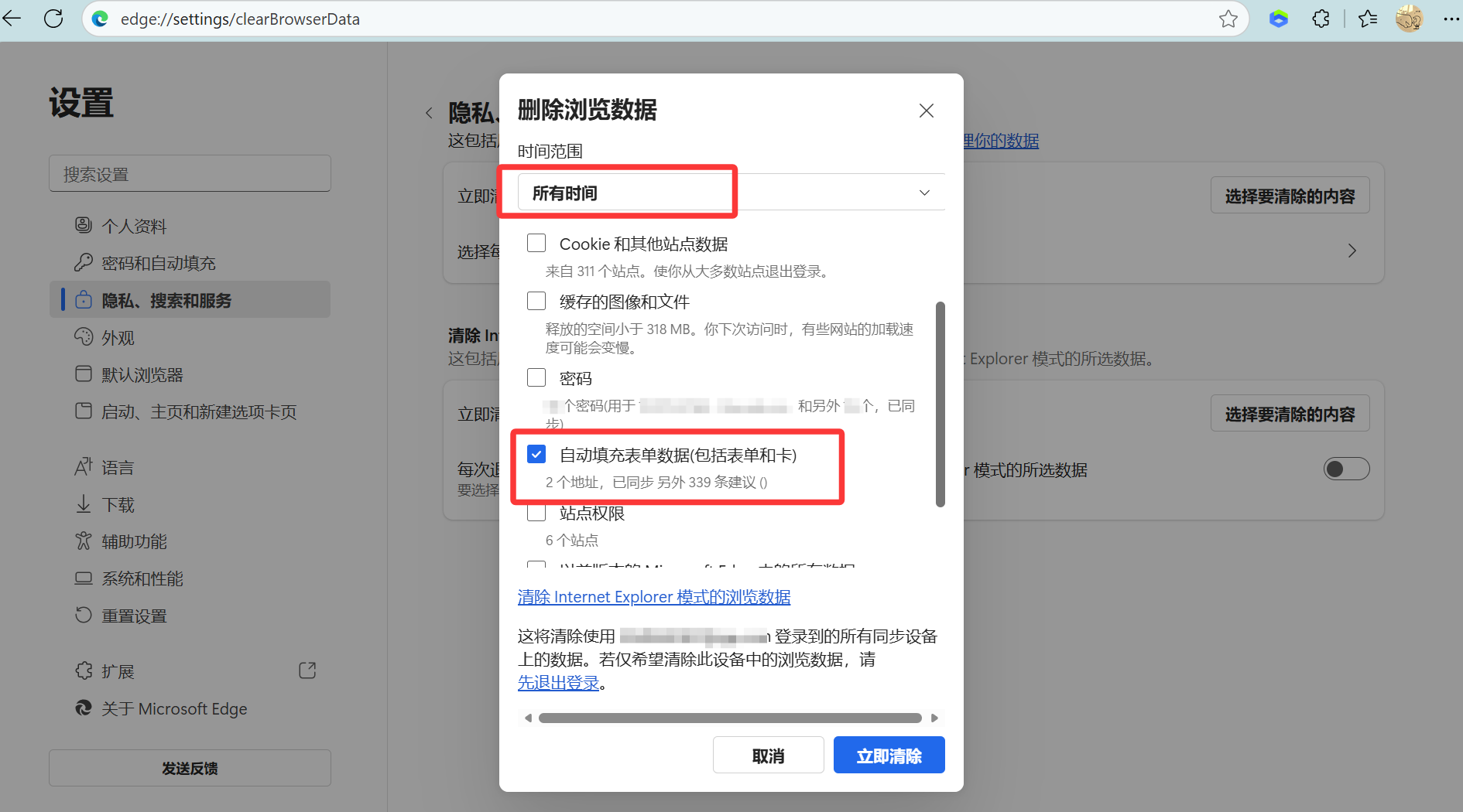 随后出现以下页面,时间范围选择“所有时间”,勾选“自动填充表单数据”,点击“立即清除”。这样就可以清理掉页面搜索框中保存的信息啦~