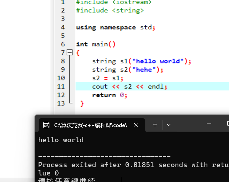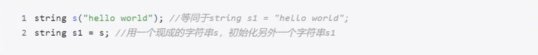 - string s2 = "hello world" 表示创建⼀个字符串s2,它的内容是" hello world ",要注意 s2 中的字符串不再以 \0 作为结束标志了。(C 语⾔中的字符串是以 \0 作为结束标志的)