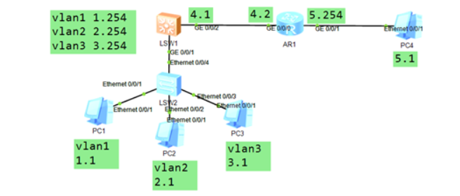 [Huawei-GigabitEthernet0/0/2]port default vlan 4 //把2口加入vlan4