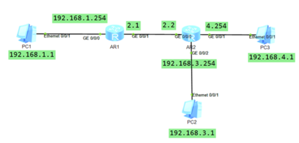 [Huawei]ip route-static 192.168.4.0 24 192.168.2.2 //添加静态路由,可以去4.0网段,掩码24,下一跳2.2