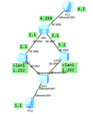 [sw1-Vlanif1]vrrp vrid 1 virtual-ip 192.168.1.254 //开启vrrp功能,组号是1,虚拟设备的ip是1.254