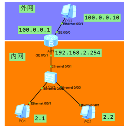 [Huawei-GigabitEthernet0/0/0]nat static global 100.0.0.2 inside 192.168.2.1 //使用静态nat技术,将内部的2.1与外部的公网地址100.0.0.2进行相互转换