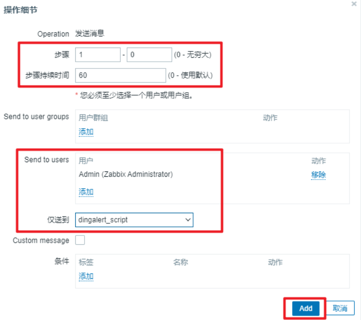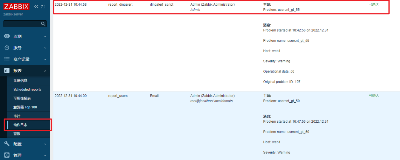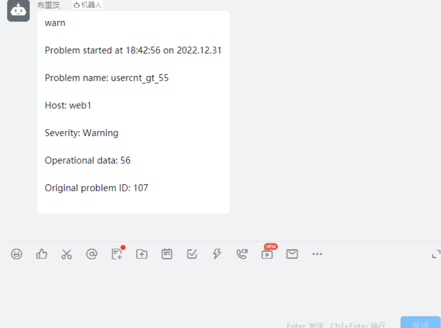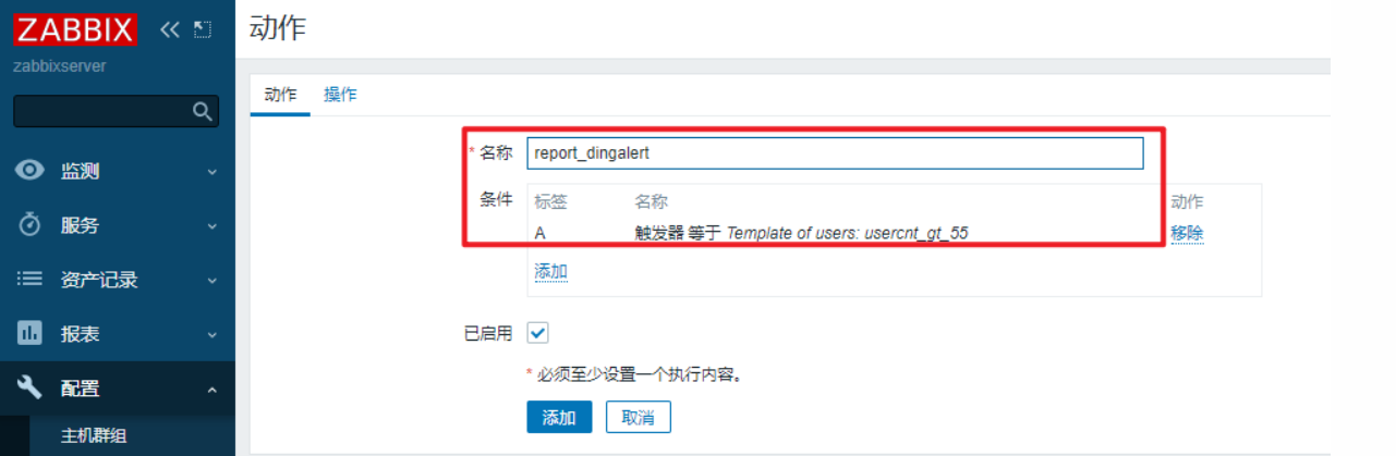 - 创建动作,用户数超过55则发送钉钉告警消息
