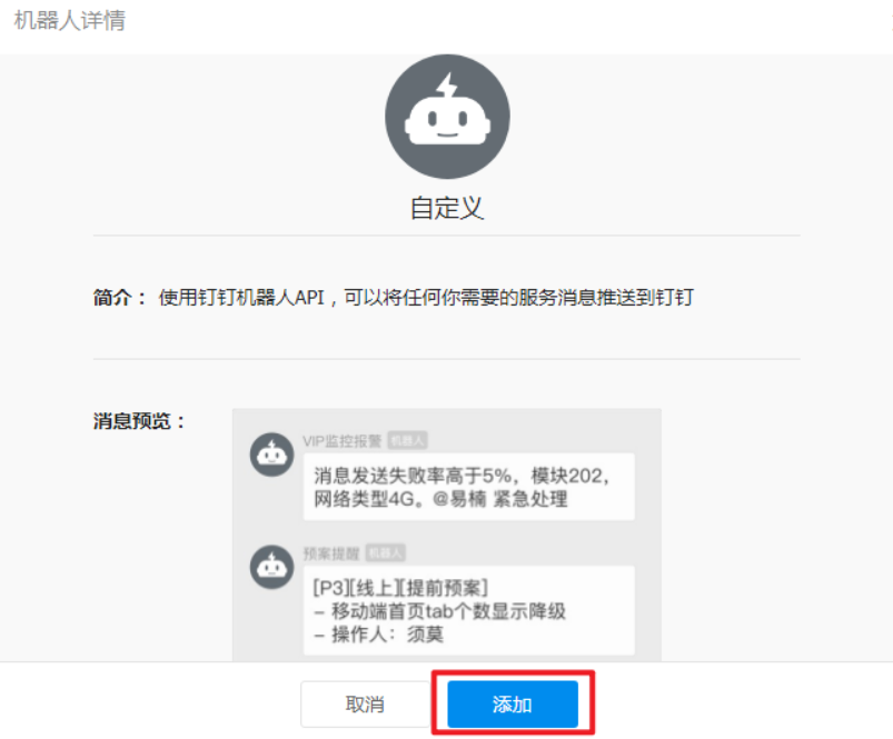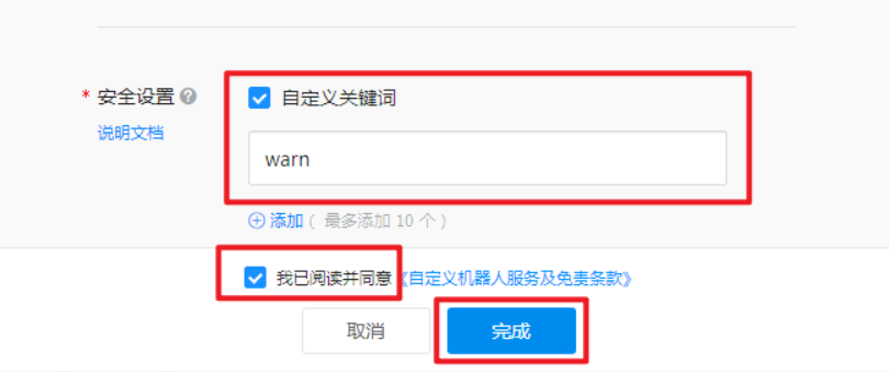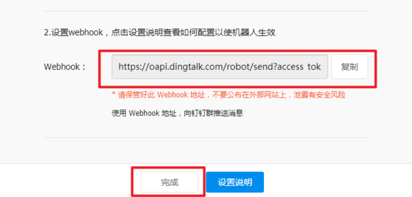 注意上面的Webhook地址,不要泄露,谁拥有此地址,谁就可以控制机器人说话。