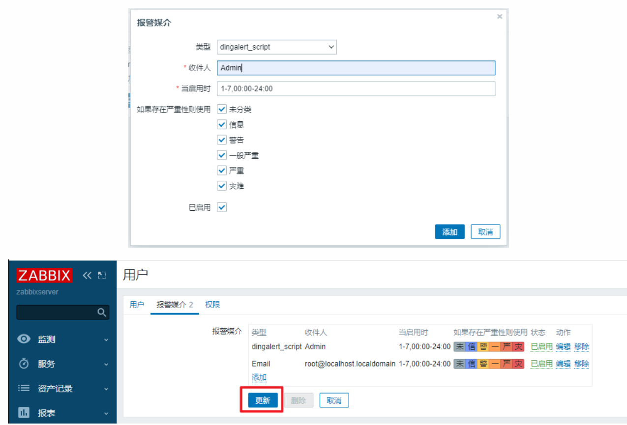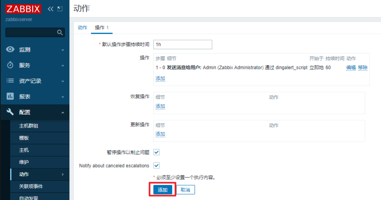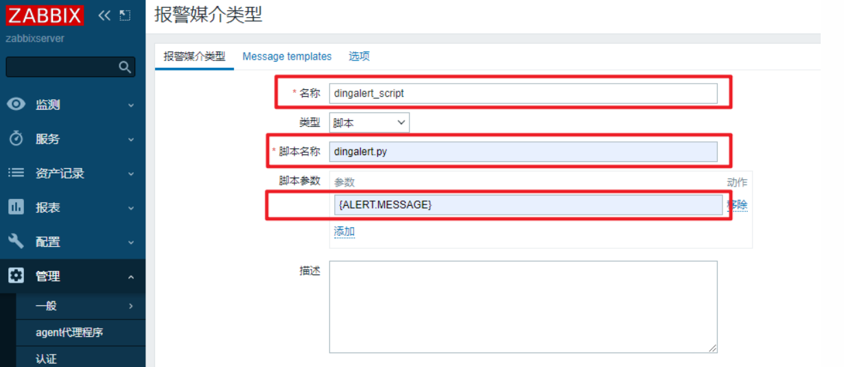 [root@zabbixserver ~]# chmod +x /usr/lib/zabbix/alertscripts/dingalert.py