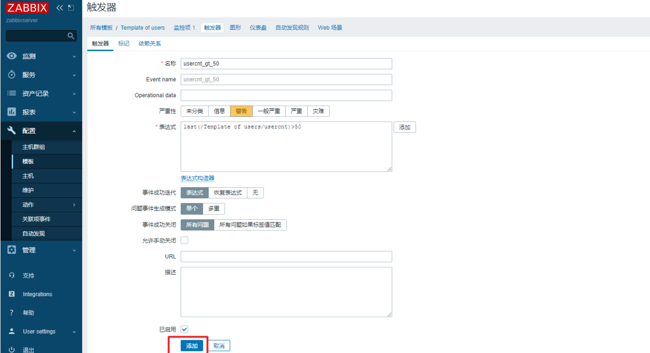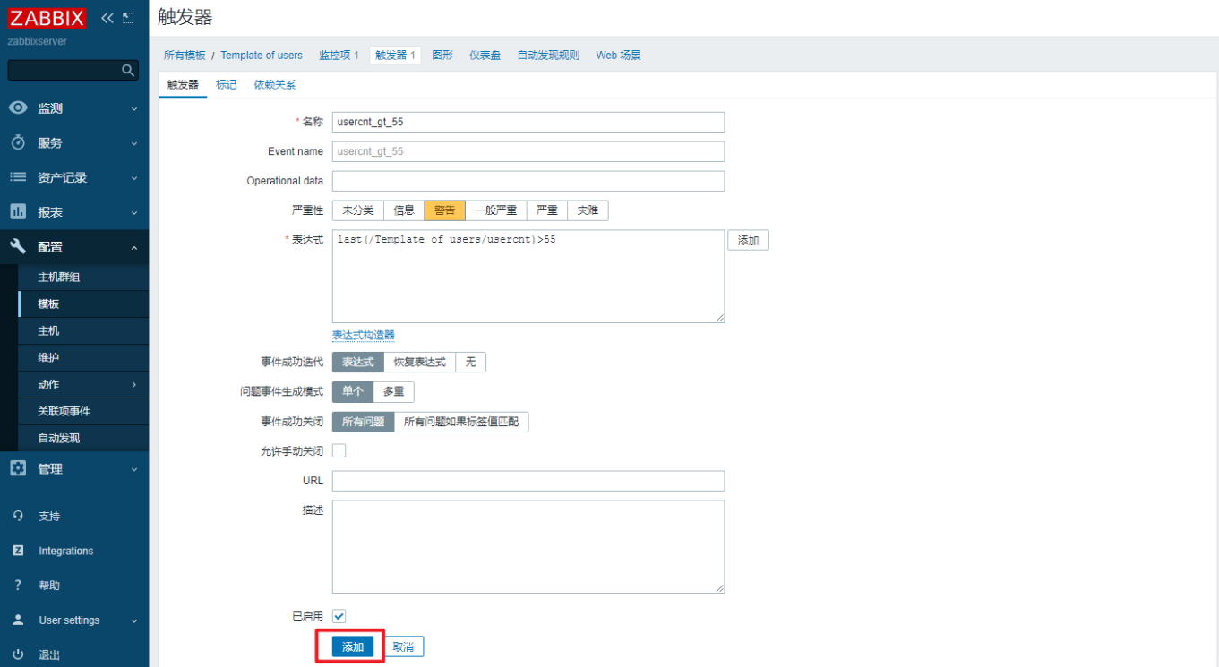 - 需要配置触发器与告警,并且通过通知方式发送信息给联系人