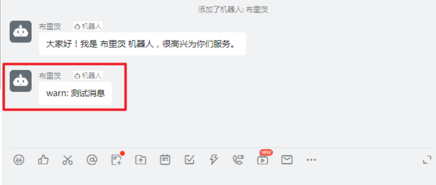 [root@zabbixserver ~]# /usr/lib/zabbix/alertscripts/dingalert.py 'warn: 测试消息' # 注意消息中要包含关键字warn