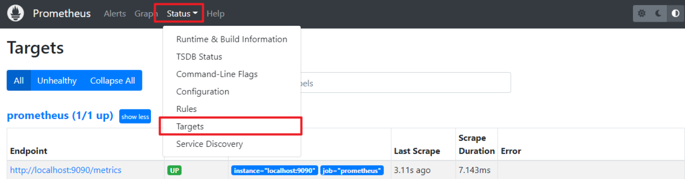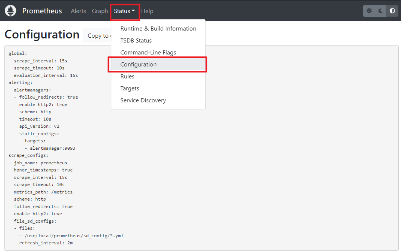 scrape_configs控制 Prometheus 监控的资源。由于 Prometheus 还将有关自身的数据公开为 HTTP 端点,因此它可以抓取和监控自身的健康状况。在默认配置中,有一个名为 的作业prometheus,用于抓取 Prometheus 服务器公开的时间序列数据。该作业包含一个单一的、静态配置的目标,即localhost的9090端口。Prometheus期望度量在/metrics路径上的目标上可用,所以这个默认作业是通过 URL 抓取的:http://localhost:9090/metrics。