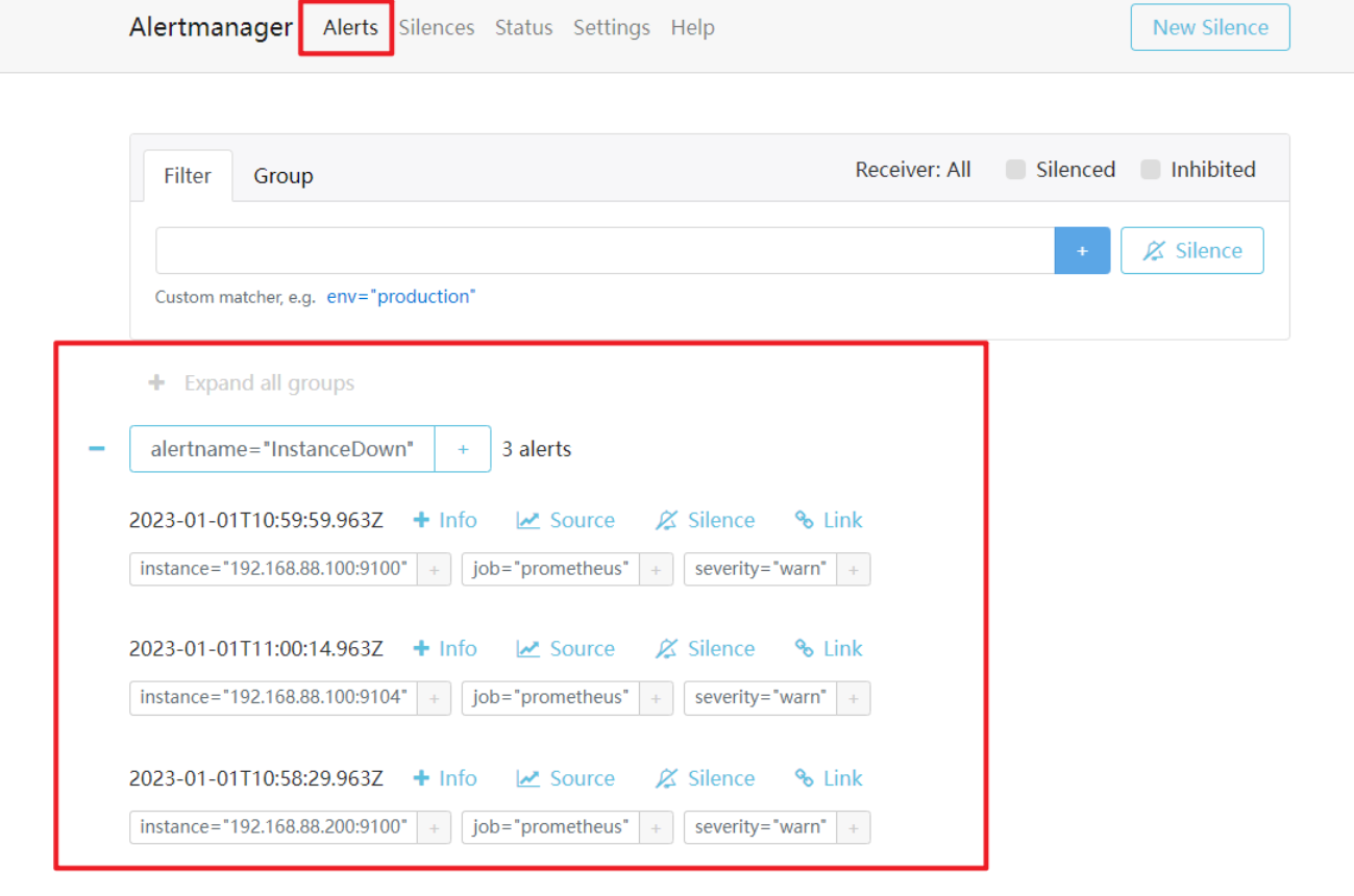 静默提供了一个简单的机制可以快速根据标签对告警进行静默处理。如果接收到的告警符合静默的配置, Alertmanager则不会发送告警通知。静默设置需要在Alertmanager的Web页面上进行设置。