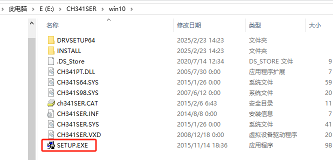1.解压产品资料"软件资料\Tools\Windows\CH341SER.zip",根据你的电脑系统进入对应目录,点击SETUP.EXE