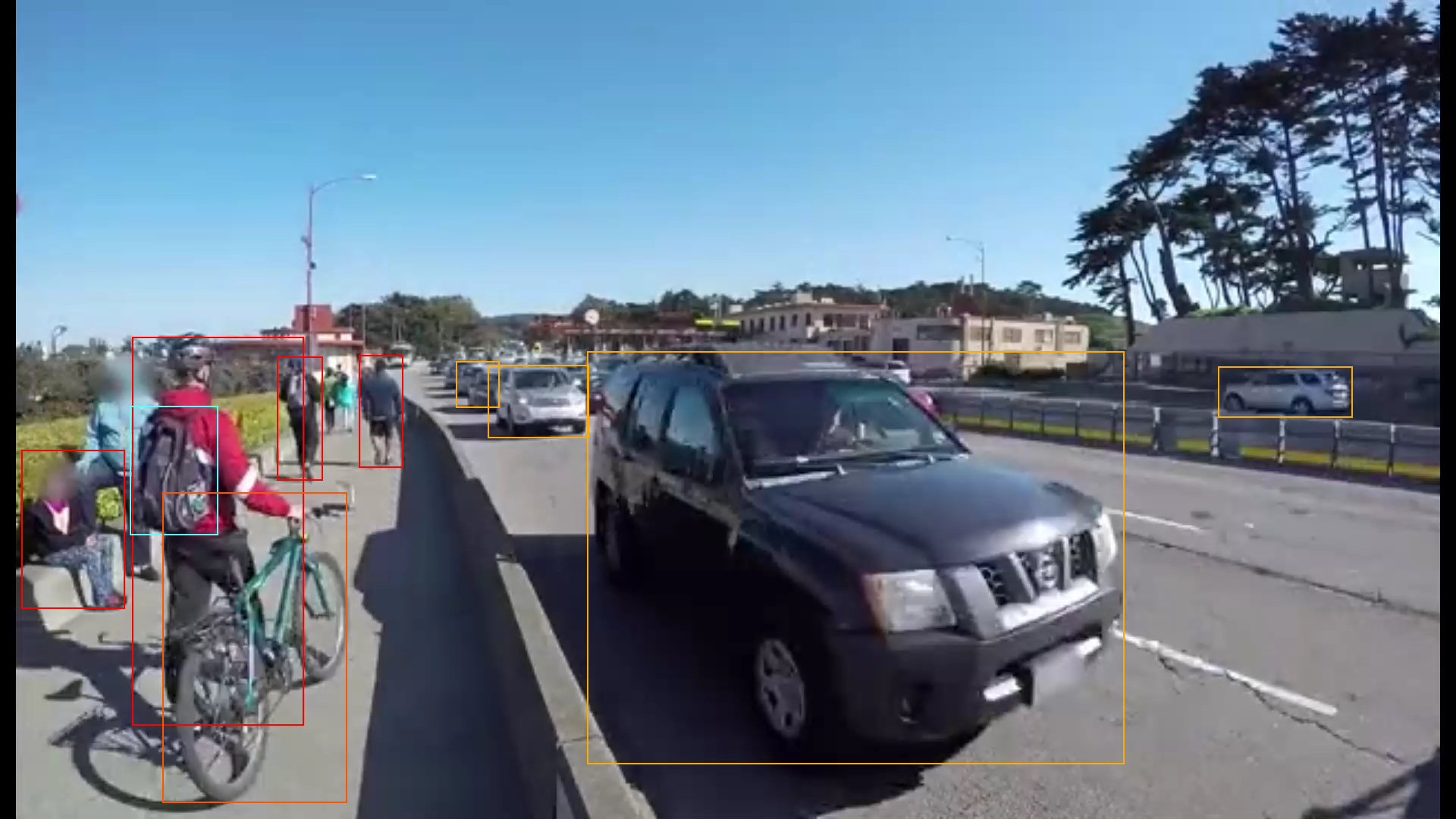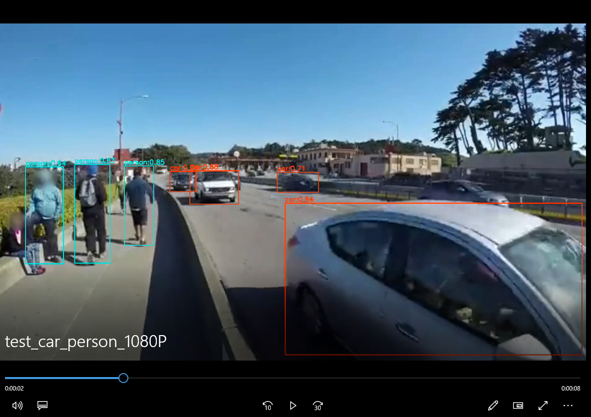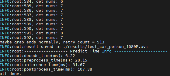 测试结束后,会将预测的结果画在results/test_car_person_1080P.avi中,同时会打印预测结果、推理时间等信息。