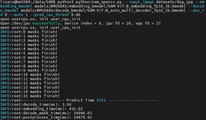 python3 python/sam_opencv.py --input_image datasets/dog.jpg --embedding_bmodel models/BM1684X/embedding_bmodel/SAM-ViT-B_embedding_fp16_1b.bmodel --decode_bmodel models/BM1684X/decode_bmodel/SAM-ViT-B_auto_multi_decoder_fp32_1b.bmodel --dev_id 0 --auto 1 --pred_iou_thresh 0.86
