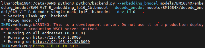 python3 python/backend.py --embedding_bmodel models/BM1684X/embedding_bmodel/SAM-ViT-B_embedding_fp16_1b.bmodel --decode_bmodel models/BM1684X/decode_bmodel/SAM-ViT-B_decoder_single_mask_fp16_1b.bmodel --dev_id 0