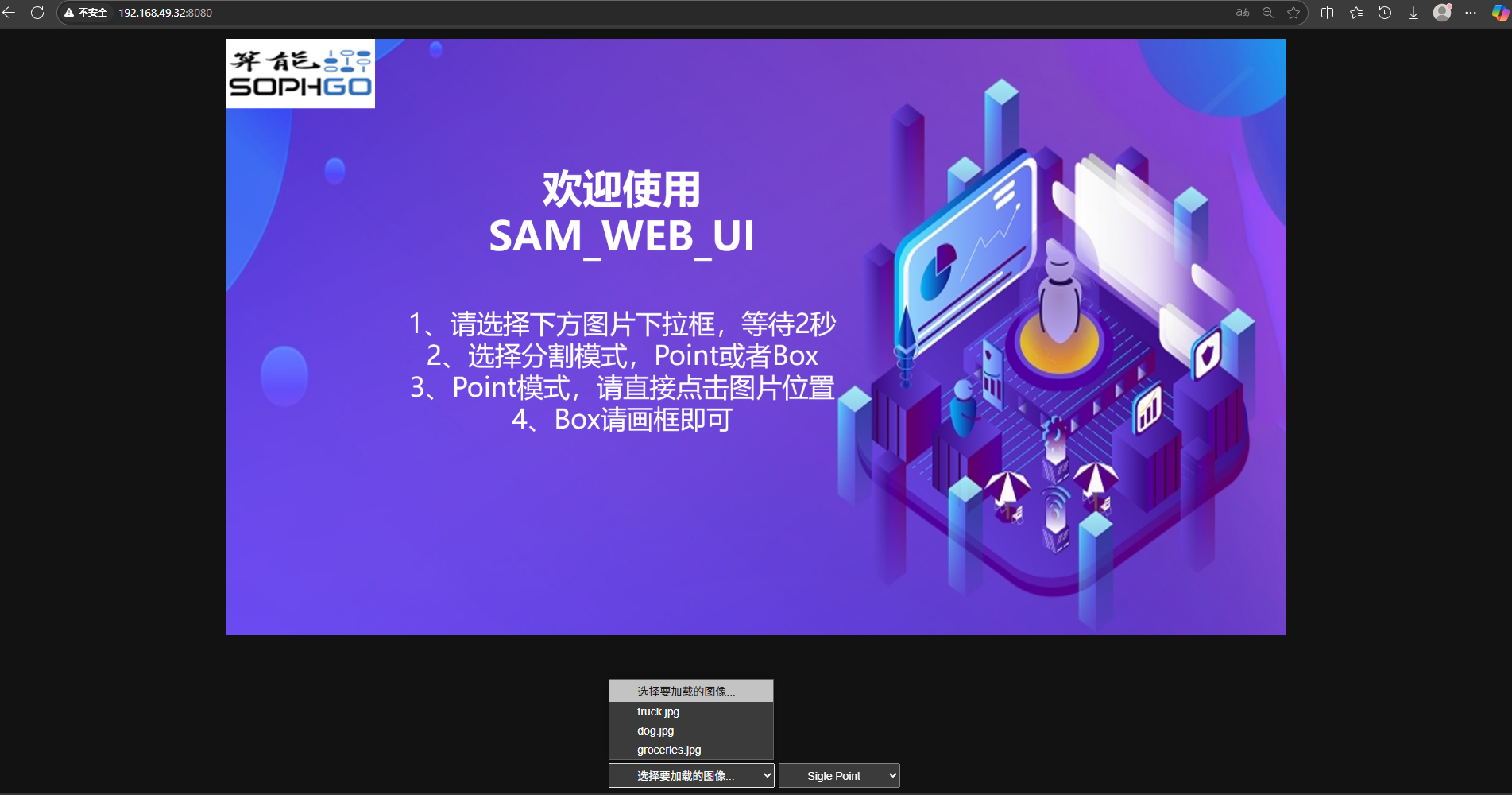 打开PC端浏览器界面,在网址处输入192.168.49.32:8080,进入交互界面,点击选择要加载的图像...的下拉框,即可选择预存图像。选择Single Point进入点击模式,Draw BOX进入框选模式