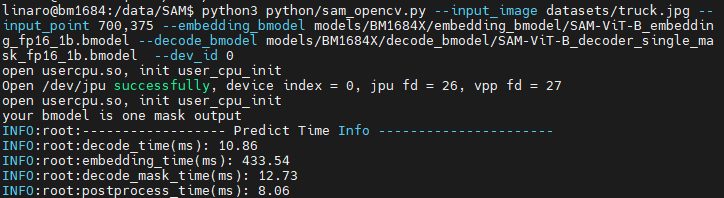 python3 python/sam_opencv.py --input_image datasets/truck.jpg --input_point 100,300,1700,800 --embedding_bmodel models/BM1684X/embedding_bmodel/SAM-ViT-B_embedding_fp16_1b.bmodel --decode_bmodel models/BM1684X/decode_bmodel/SAM-ViT-B_decoder_multi_mask_fp16_1b.bmodel --dev_id 0