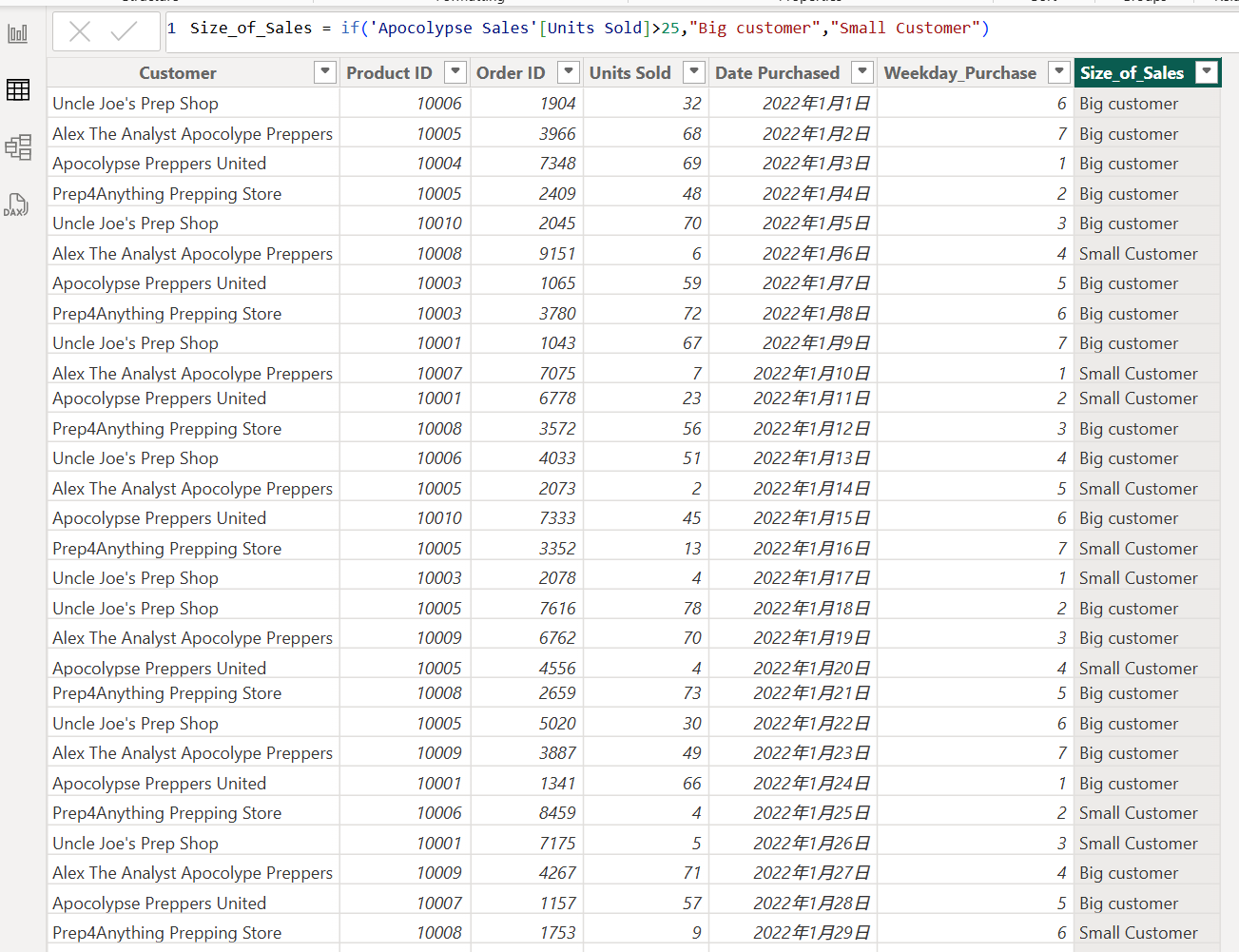Size_of_Sales = if('Apocolypse Sales'[Units Sold]>25,"Big Customer","Small Customer")