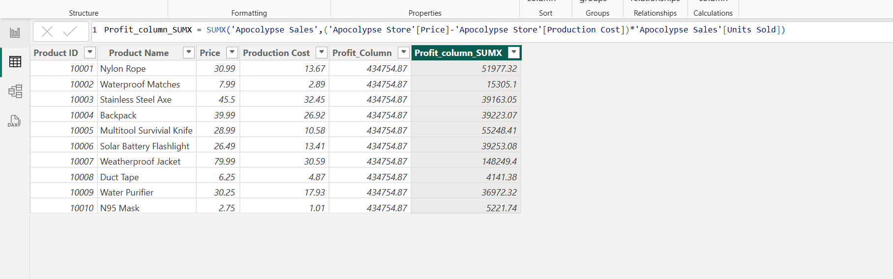 Profit = (sum('Apocolypse Store'[Price])-sum('Apocolypse Store'[Production Cost]))*sum('Apocolypse Sales'[Units Sold])