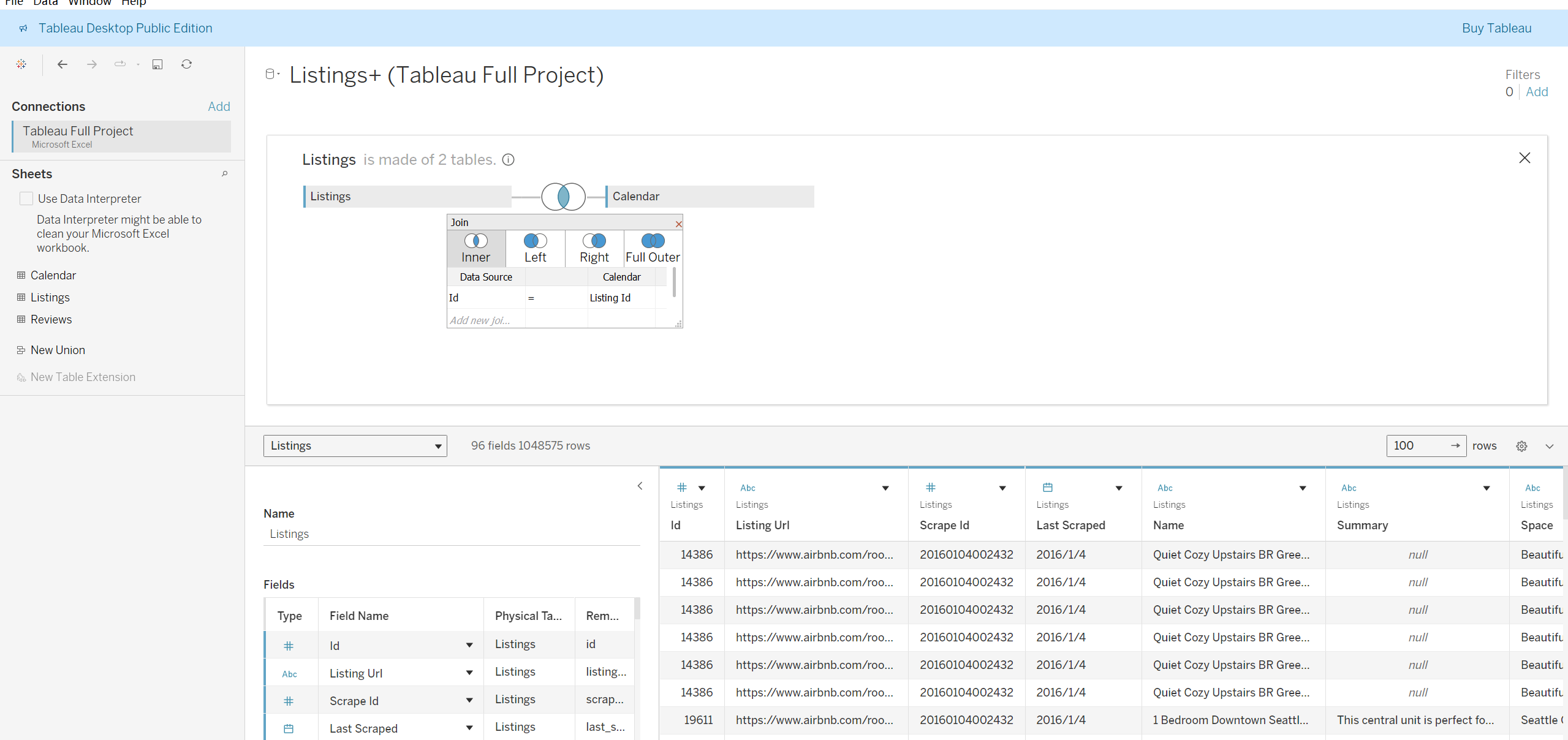 内连接listings和Calender的目的在于 精确关联房源与其日历数据,排除不完整记录,确保分析结果基于有效、匹配的数据。操作:首页导入Microsoft Excel,将listings表移到中央,右击listings,点击Open进入连接状态,然后将Calender移入进行内连接,此处注意将连接的内容改成Id=listing_id,因为这样的id内容才是真正相等的。