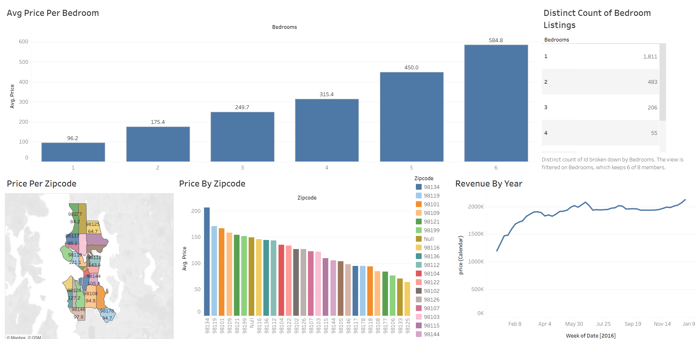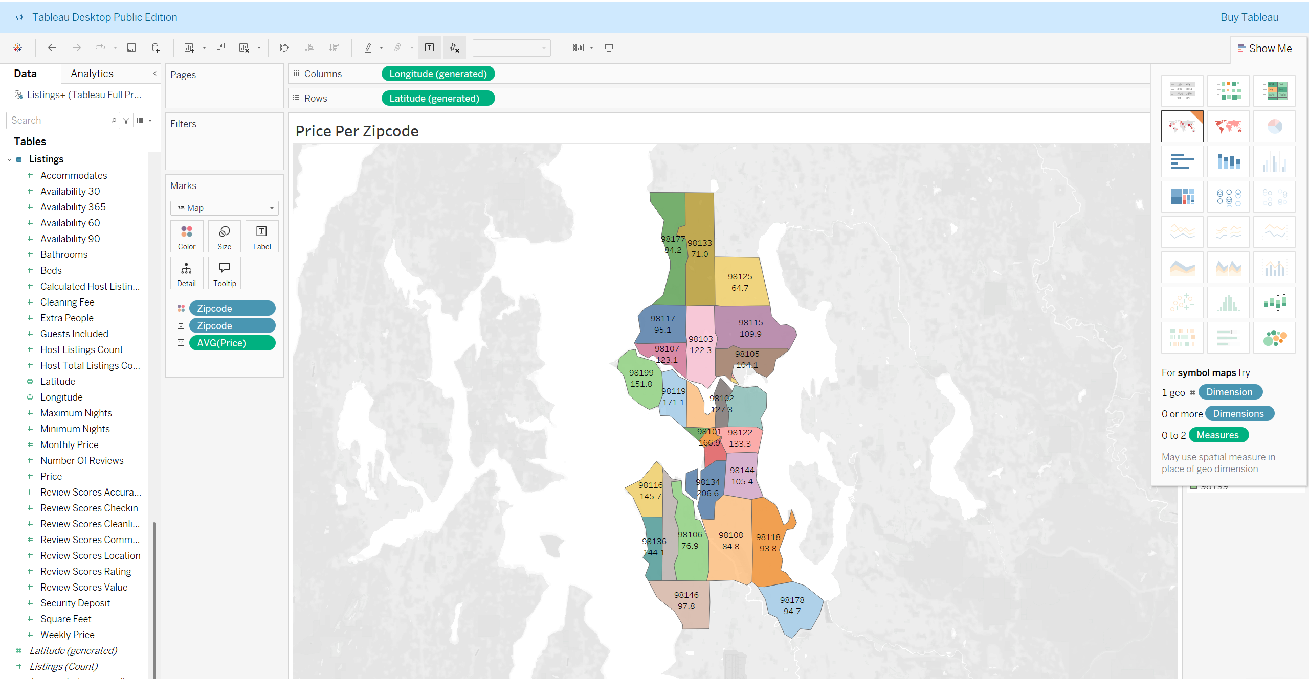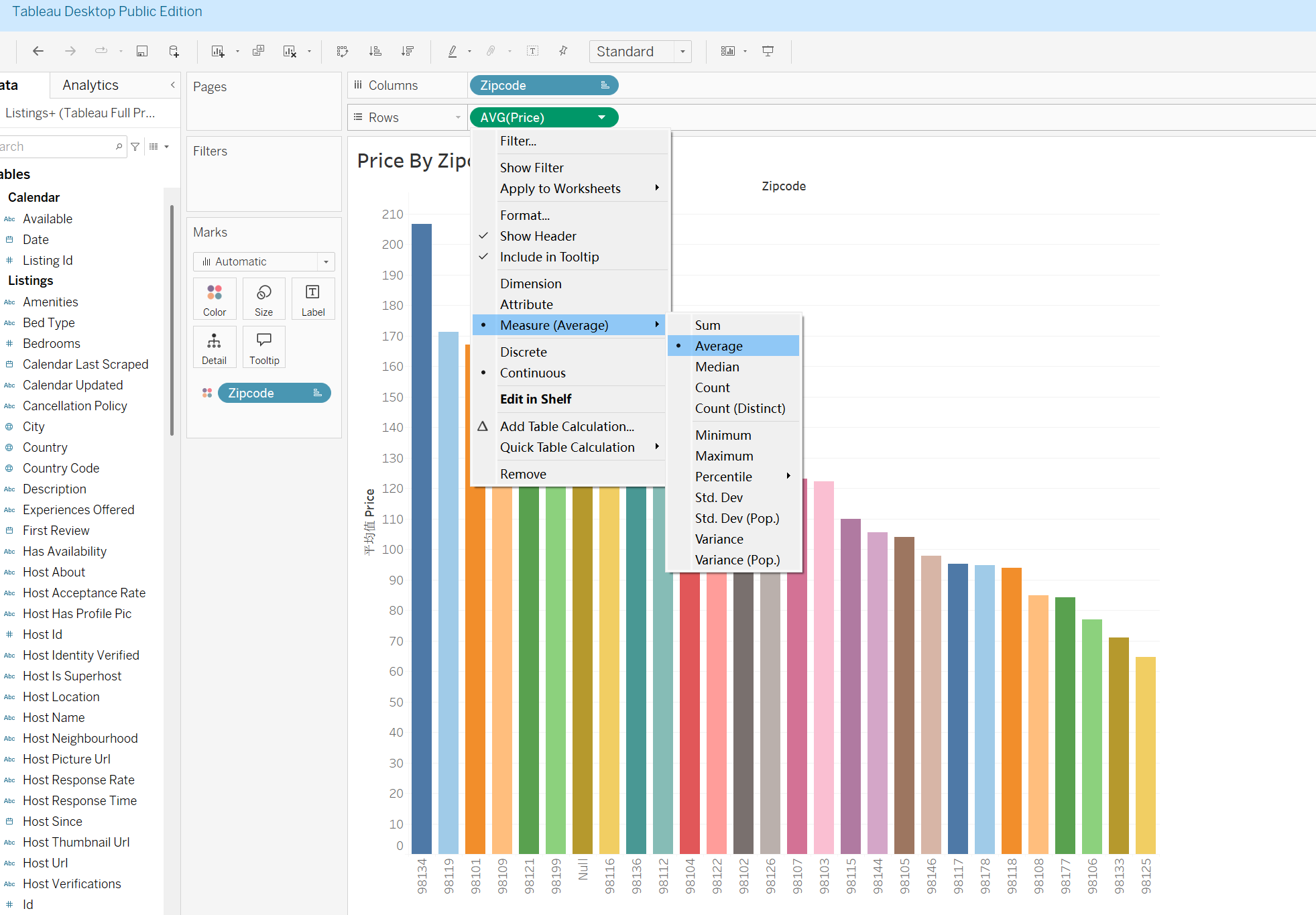 1、假设你的客户要寻找一个适合开airbnb的地方,这幅图便可以用数据向他展示哪一个地区的airbnb收入最高。我们选择Zipcode放在Columns,Zipcode代表的是邮政编码,不同的 ZipCode通常代表不同的地理区域,Price放在Rows,右击Price选择Measures→选择Average,再将Zipcode放在Marks处,点击Colors,我们第一个可视化内容便制作成功啦!我们可以清晰地看到编码为98134的地区的价格最高,表面此处的盈利效果最佳,可以推荐给客户。