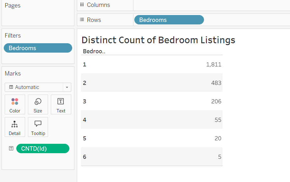 5、假设你的客户还想知道不同卧室数量的房源在市场上的供应比例,以了解竞争关系,此时第五个图便可以为他解答。这是一个简单的数据展示, 我们把Bedrooms数据放在Rows和Filter,在Marks处放入Id,右击选择Measures中的Count Distinct,选择Distinct是为了明确市场上有多少种不同的卧室户型(1-6卧),而非统计房源总数。如果需要分析房源总量,则应去掉Distinct。由图中数据可以看出: