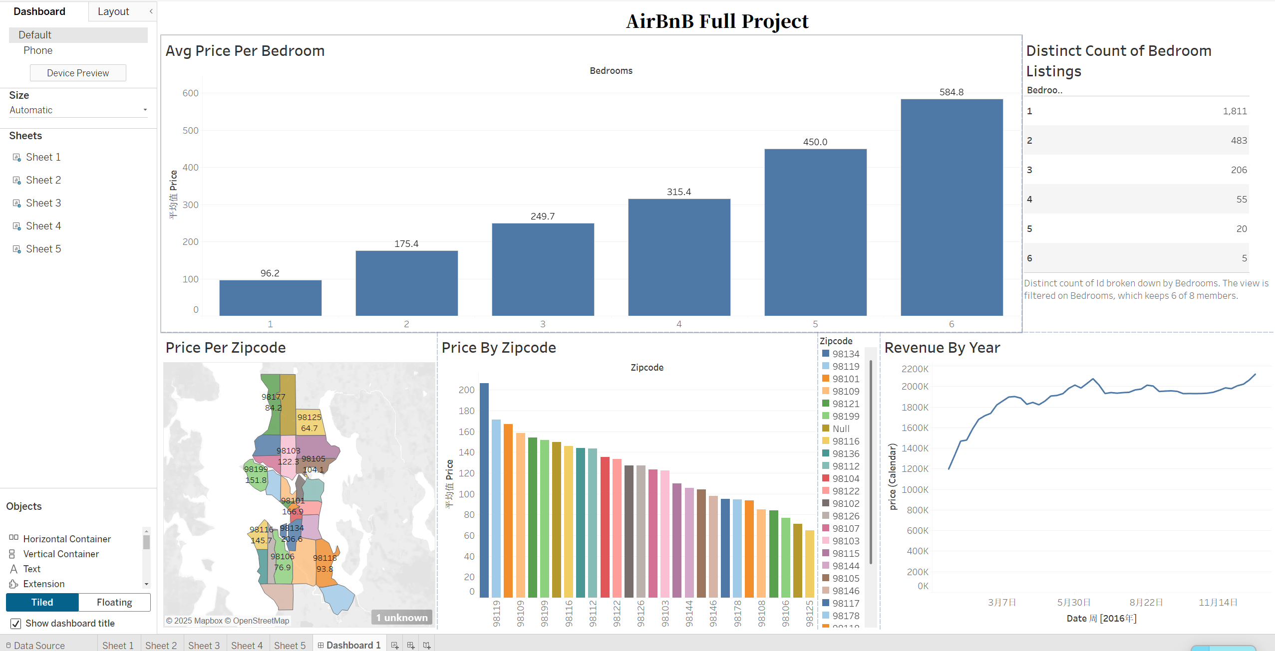 五个可视化内容制作完毕,接下来我们将它们排列好制成一个整洁的Dashboard。进入Dashboard界面之后,将左边的Size改为Automatic,这样可以将Sheet布满整个界面,记得给每一个Sheet修改标题并给仪表盘命名一个标题,此时我们的仪表盘便制作完成了!