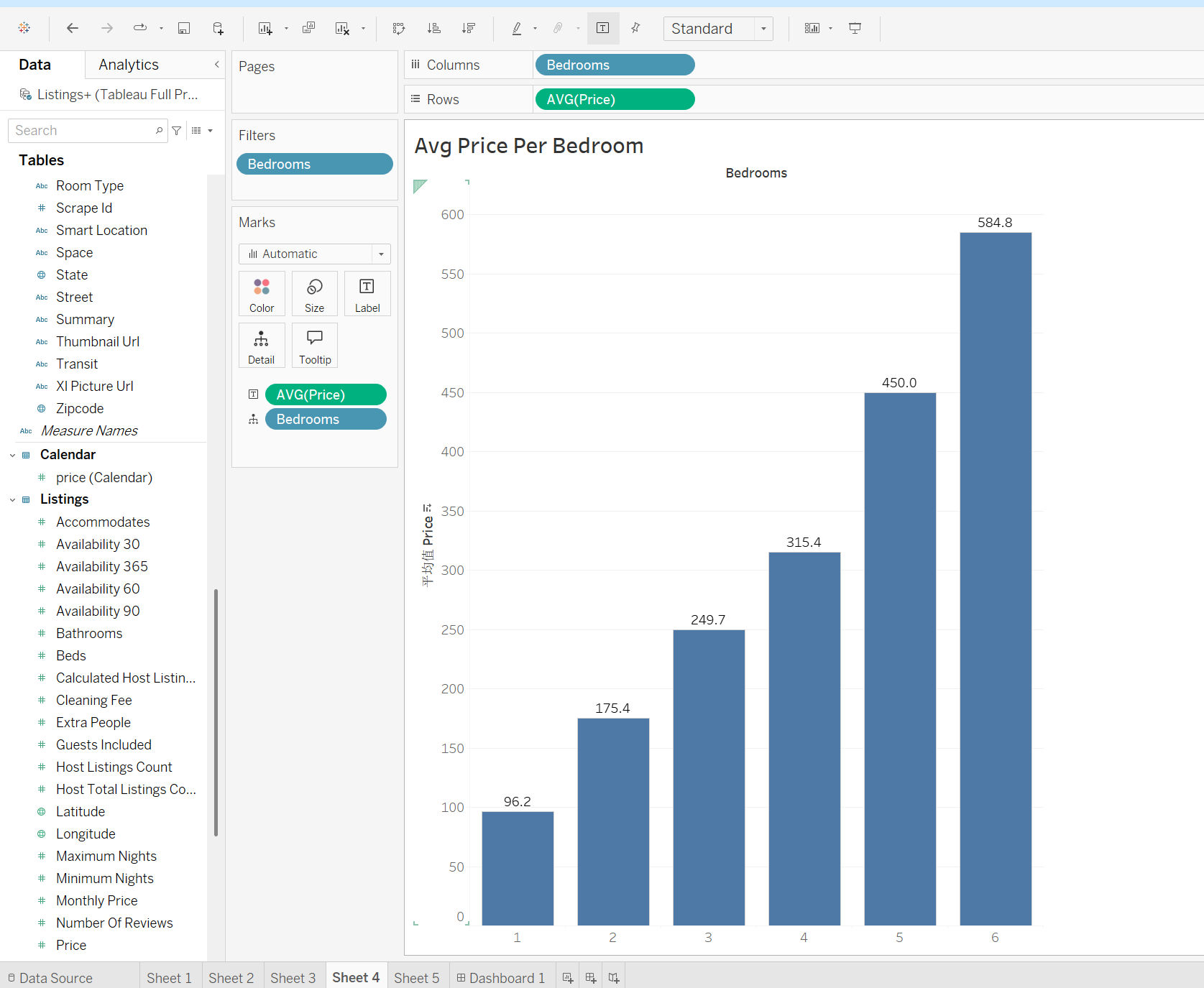 4、我们第四个可视化内容通过对比不同卧室数量的房源的平均价格,从而观察卧室数量对价格的影响,如下图所示,x轴内容是卧室数量,y轴是平均收费价格,可以看出房源卧室数量与平均收费价格是呈现正相关关系的,设立卧室数量越多,收入越多。这里要将Bedrooms放到filter里面去掉null空值和0卧室的情况,把Price改为AVG平均价格状态,在Marks处加上数据标签,此时第四个可视化内容便成功制作!