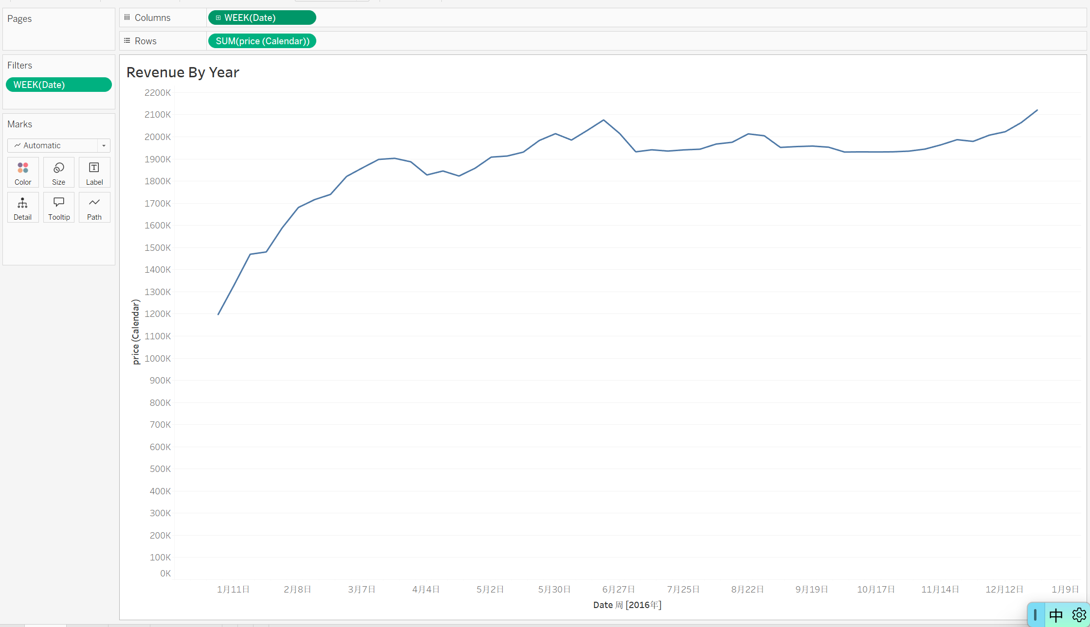 3、假设你的客户想知道一年之中什么时候将房子租出去最挣钱,第三幅可视化图便可以回答他这个问题。我们将Calender中的Date放在Column处,然后右击选择Week Number,将price(Calender)放在Rows处,然后把这个Date同样改成Week Number格式,在Filter那里去掉Null和0的值,最后我们为了只展示2016年的数据情况,需要右击WEEK(Date)→点击Show Filter,把终止时间改为2016/12/30,这样我们便得到如下图所示的线图,可以看出,1月到6月这个区间客源还不是特别稳定且价格较低,6月到年末的区间客源多价格高,我们便可以回答客户夏天开始后这段时间把房子放出去租是最挣钱的;