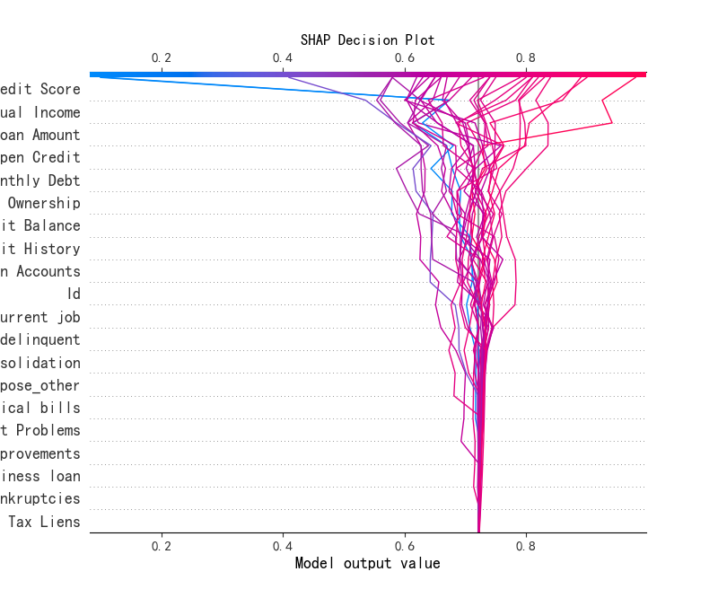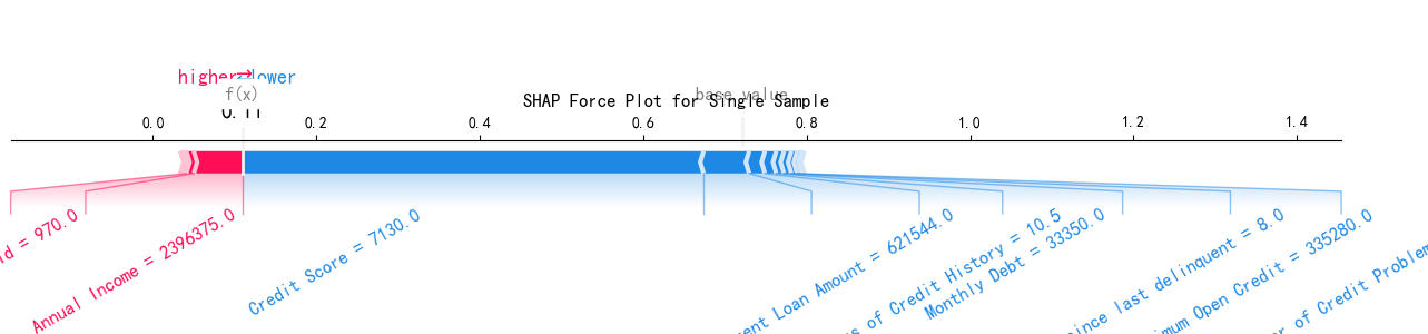 下列这段代码的主要目的是使用 shap 库的 force_plot 函数可视化测试集中第一个样本的预测结果,展示每个特征对预测结果的贡献。 matplotlib=True 表示使用 matplotlib 库绘图, show=False 表示不立即显示图表,需要后续调用 plt.show() 来显示, text_rotation=30 则是设置图表中文本的旋转角度。