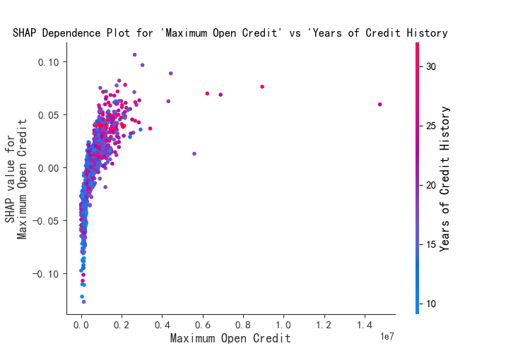 plt.title("SHAP Dependence Plot for 'Maximum Open Credit' vs 'Years of Credit History")