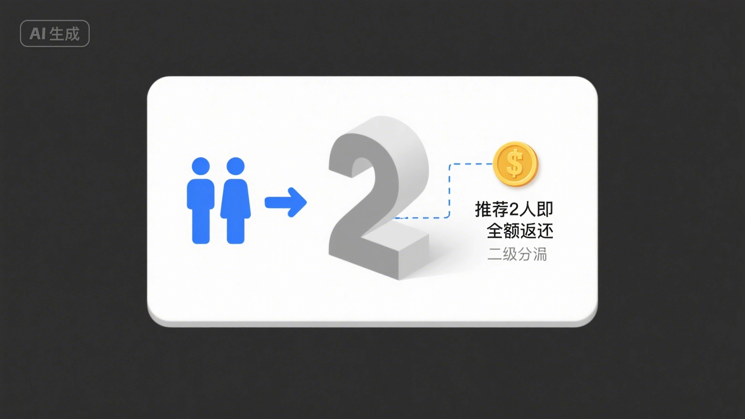 这里的 “2” 指代两级收益分配机制。不同于多层级的复杂体系,它仅围绕推荐关系设置两层奖励 —— 当用户成功推荐两人时,即可获得相应收益反馈。若产品利润空间允许,甚至能实现 “推荐两人即全额返还” 的设计,这种 “低门槛高反馈” 的设定,极大降低了用户的行动阻力。