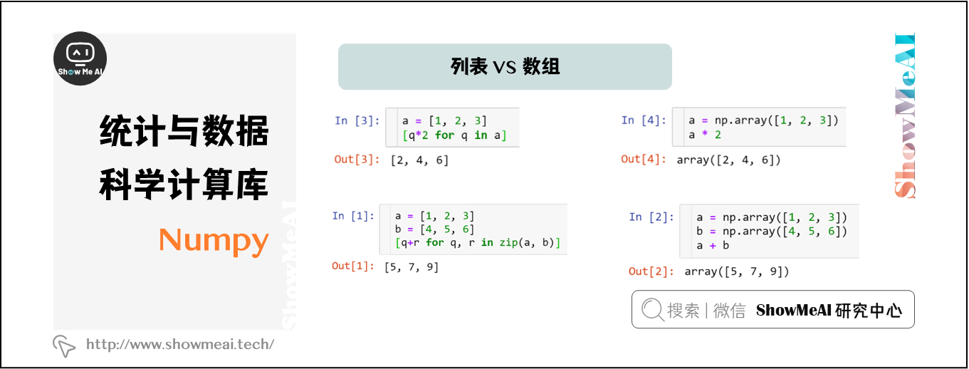 但NumPy数组因其广播特性可以直接进行算术运算,而Python列表则需要用列表推导式等操作来完成。对比示例如下(左侧为列表,右侧为NumPy数组):
