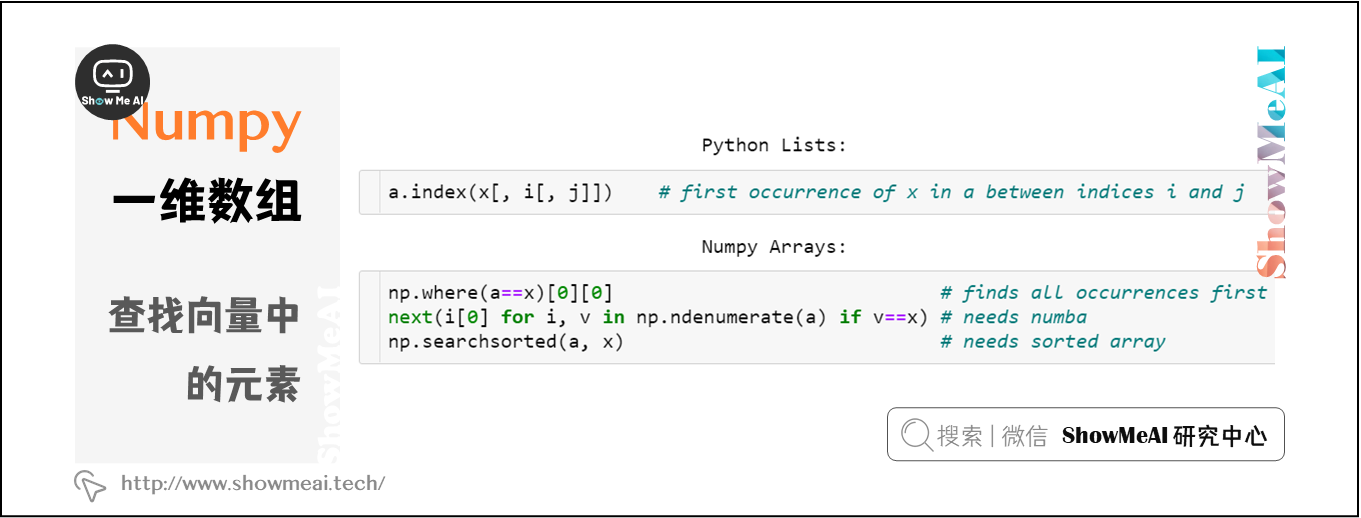 NumPy数组并没有Python列表中的索引方法,索引数据的对比如下: