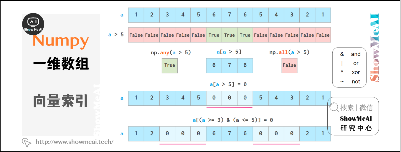 NumPy数组支持通过布尔索引获取数据,结合各种逻辑运算符可以有很高级的数据选择方式,这在Python列表中是不具备的: