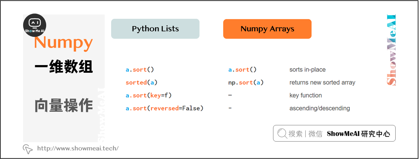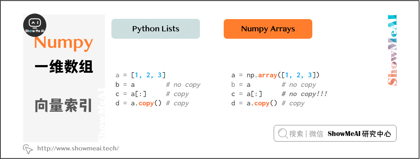 上述所有这些方法都可以改变原始数组,即允许通过分配新值改变原数组的内容。这导致无法通过切片来复制数组。如下是python列表和NumPy数组的对比: