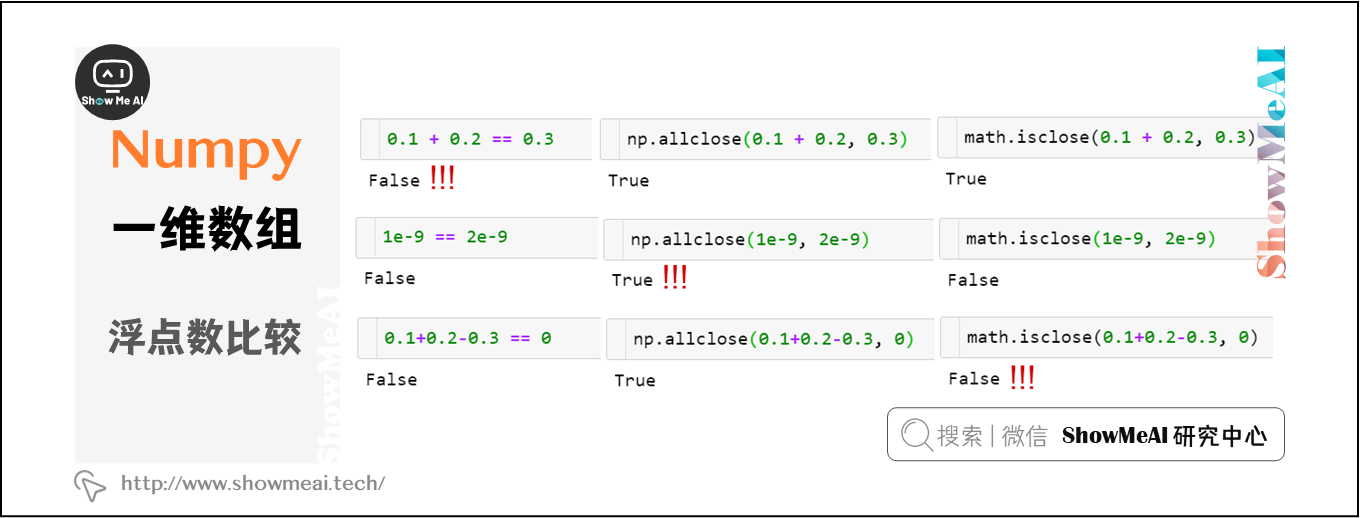 np.allclose(a, b)用于容忍误差之内的浮点数比较。