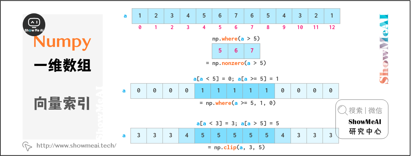 如上所述,布尔索引是可写的。如下图 np.where 和 np.clip 两个专有函数。