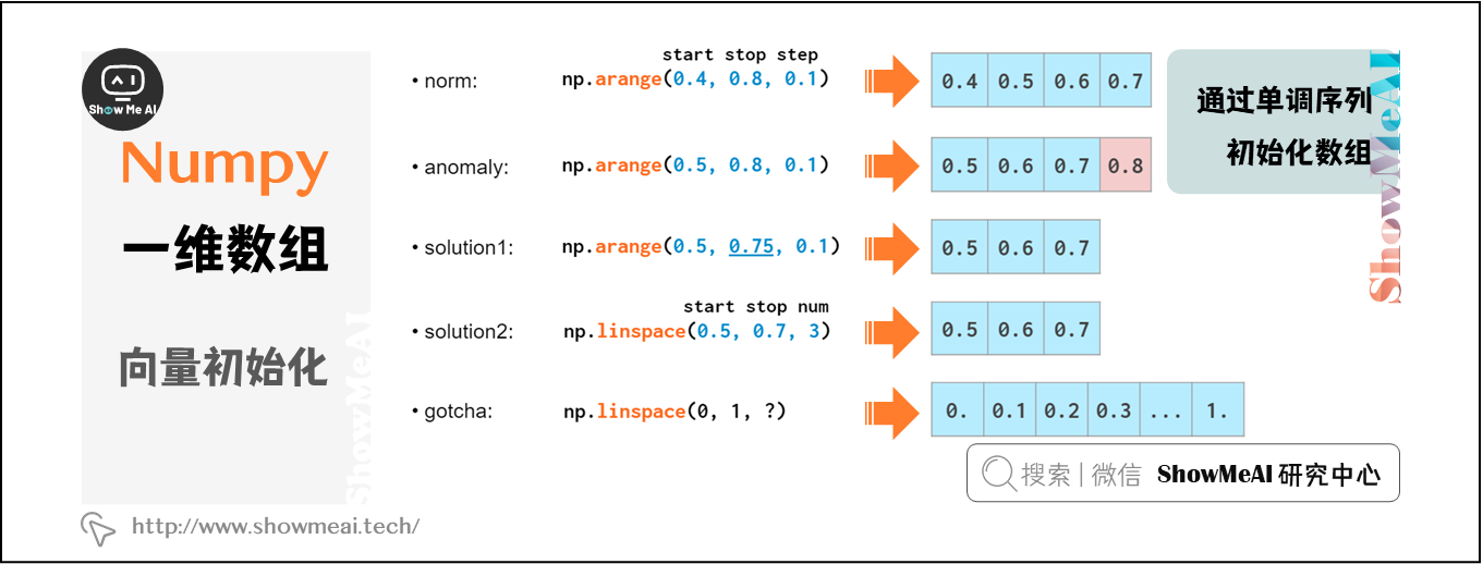 图中,0.1对我们来说是一个有限的十进制数,但对计算机而言,它是一个二进制无穷小数,必须四舍五入为一个近似值。因此,将小数作为arange的步长可能导致一些错误。可以通过以下两种方式避免如上错误: