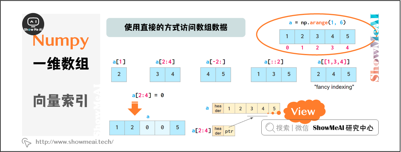 图中,除“fancy indexing”外,其他所有索引方法本质上都是views:它们并不存储数据,如果原数组在被索引后发生更改,则会反映出原始数组中的更改。