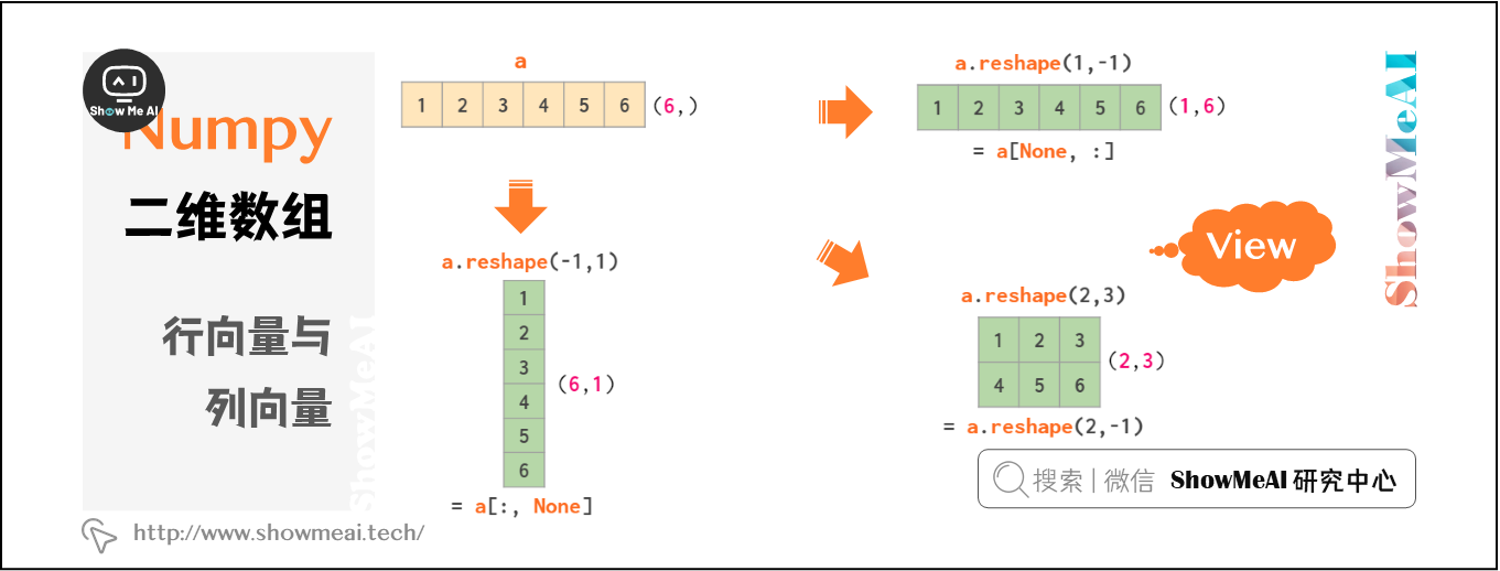 严格来说,除一维外的所有数组的大小都是一个向量(如a.shape == [1,1,1,5,1,1]),因此NumPy的输入类型是任意的,但上述三种最为常用。可以使用np.reshape将一维矢量转换为这种形式,使用np.squeeze可将其恢复。这两个功能都通过view发挥作用。