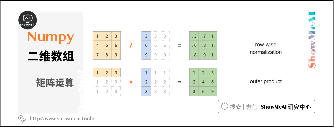 类似一维向量中的广播机制,NumPy同样可以通过广播机制实现向量与矩阵,或两个向量之间的混合运算,如下图所示: