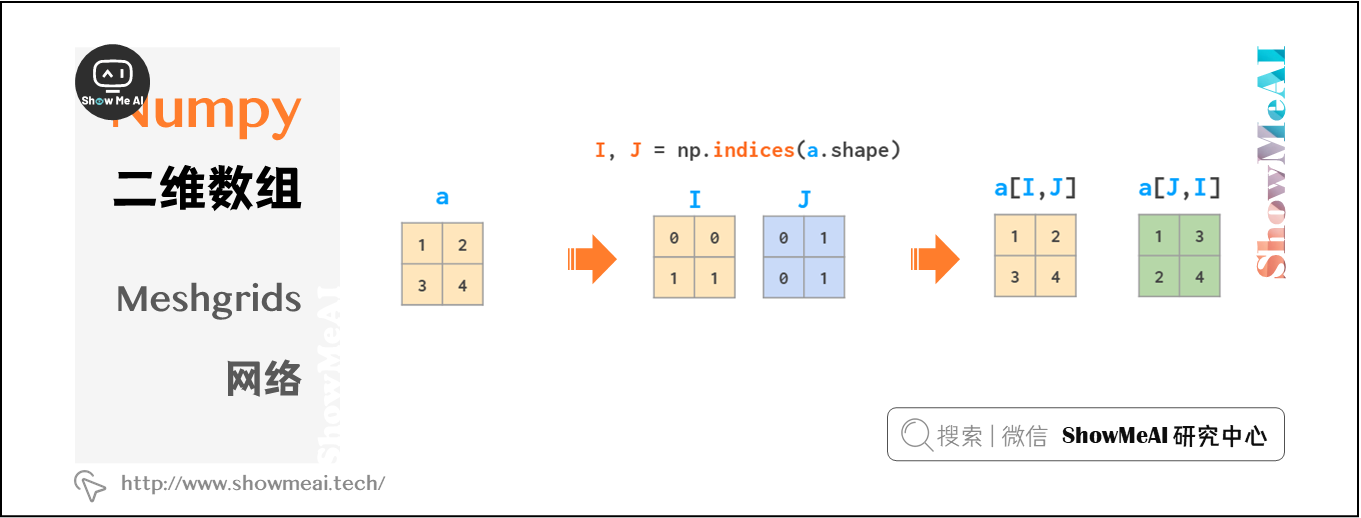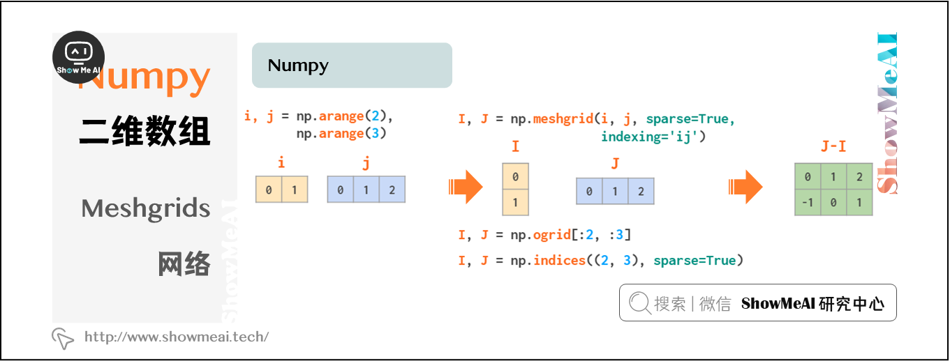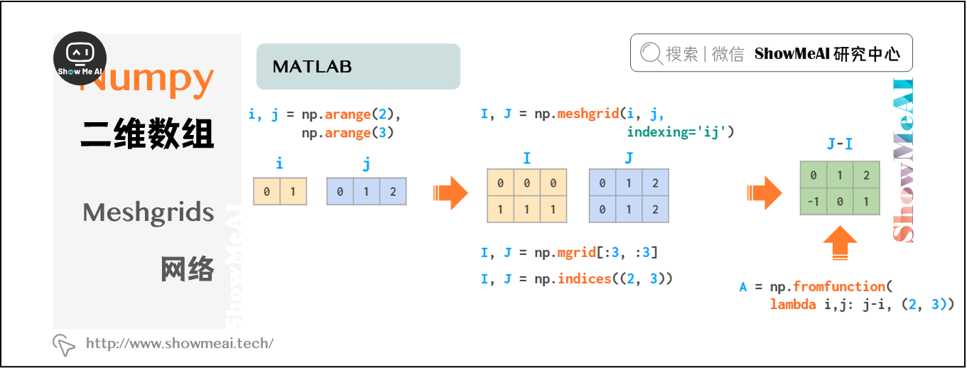 meshgrid函数接受任意一组索引,通过mgrid切片和indices索引生成完整的索引范围,然后,fromfunction函数根据I和J实现运算。