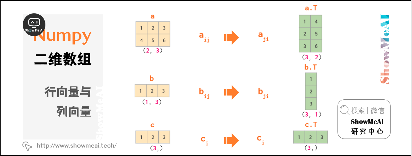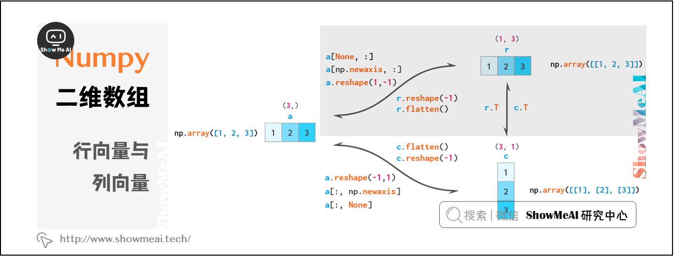 总结一下,NumPy中共有三种类型的向量:1维数组,2维行向量和2维列向量。以下是两两类型转换图: