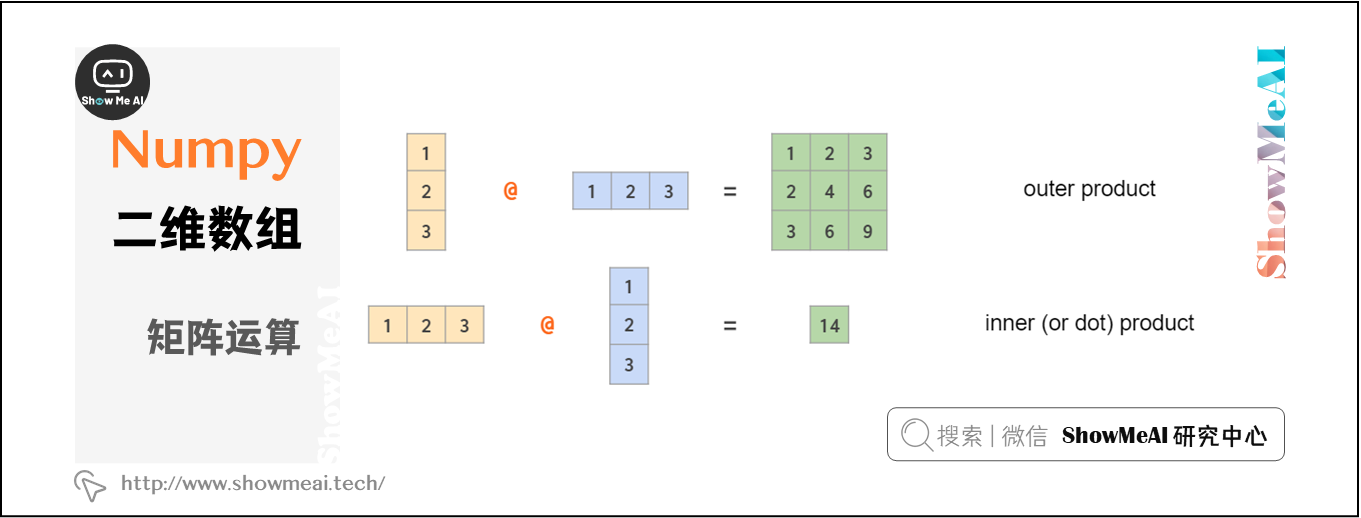 注意,上图最后一个示例是对称的逐元素乘法。使用矩阵乘法@可以计算非对称线性代数外积,两个矩阵互换位置后计算内积: