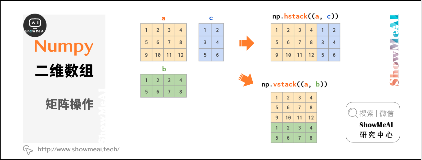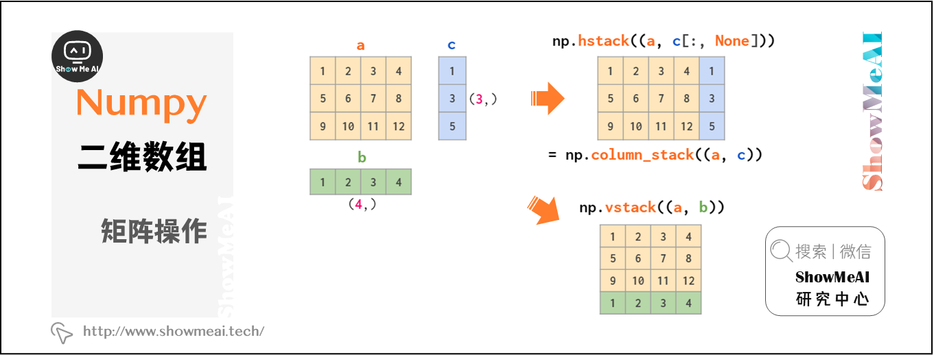 图示操作仅适用于矩阵堆叠或向量堆叠,而一维数组和矩阵的混合堆叠只有通过vstack才可实现,hstack会导致维度不匹配错误。因为前文提到将一维数组作为行向量,而不是列向量。为此,可以将其转换为行向量,或使用专门的column_stack函数执行此操作: