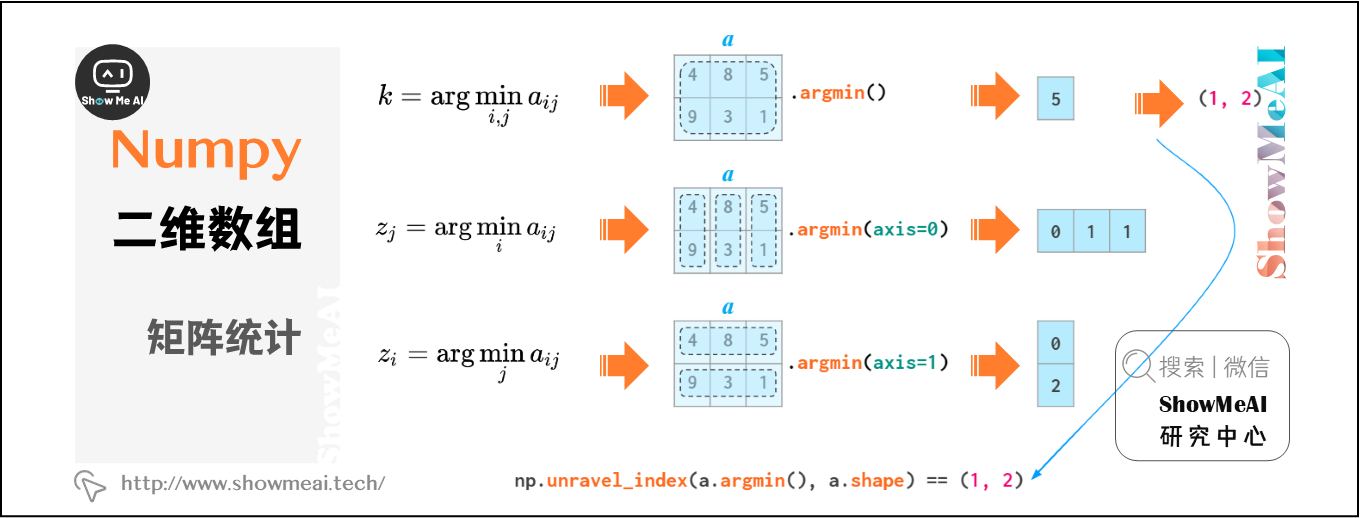 2维及更高维中的argmin和argmax函数分别返回最小和最大值的索引,通过unravel_index函数可以将其转换为二维坐标:
