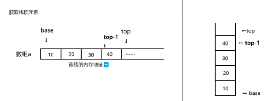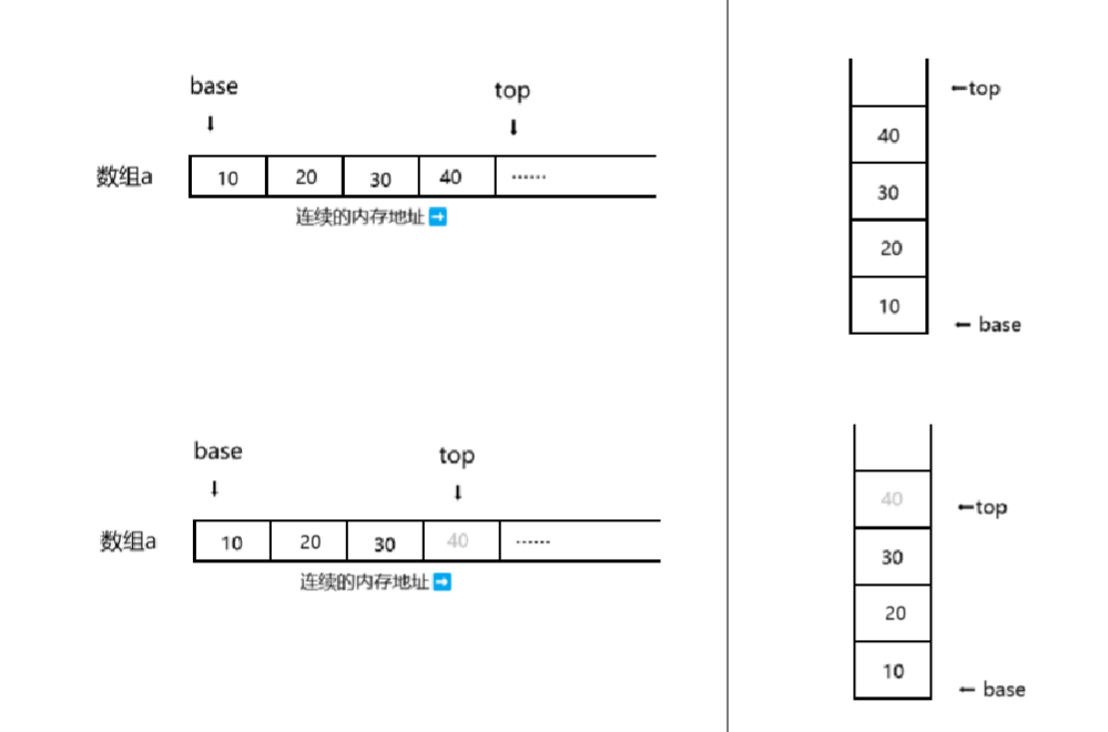 采用以上的方式,依次存储元素 20、30 和 40。base始终指向数组首地址,top总是指向栈顶元素的下一个位置。如下图所示