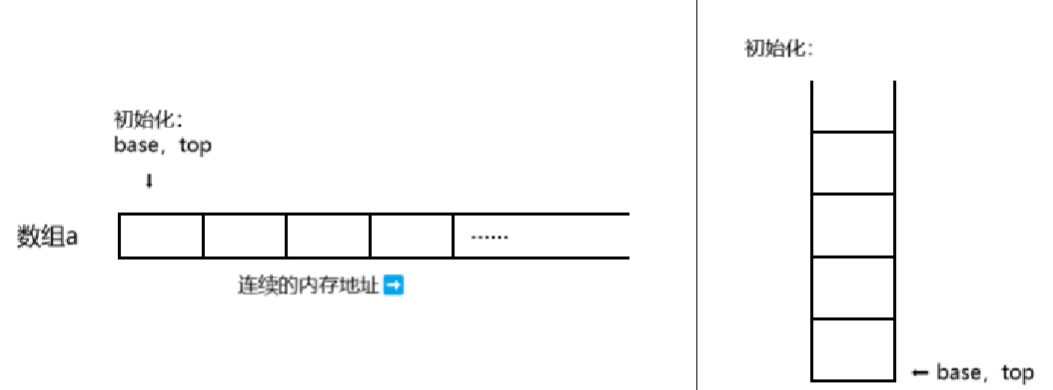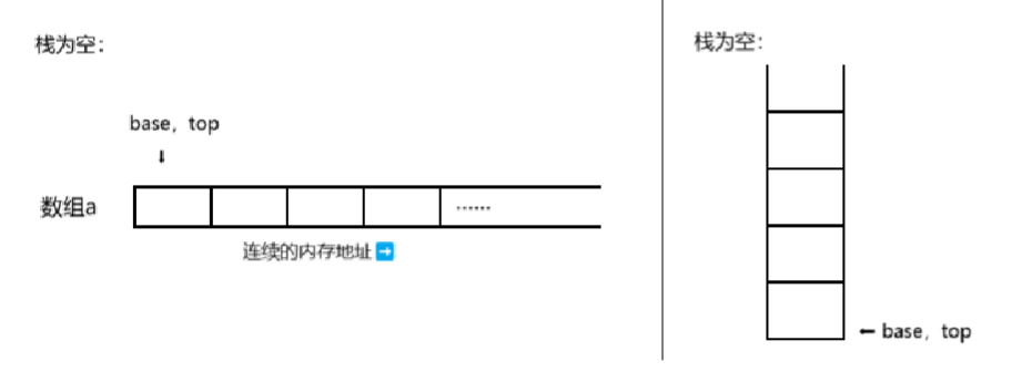 最初,栈是"空栈",即数组是空的,top、base指向数组的首地址(这种设计让空栈的判断变得非常简单直观,不需要额外标志位),如下图所示