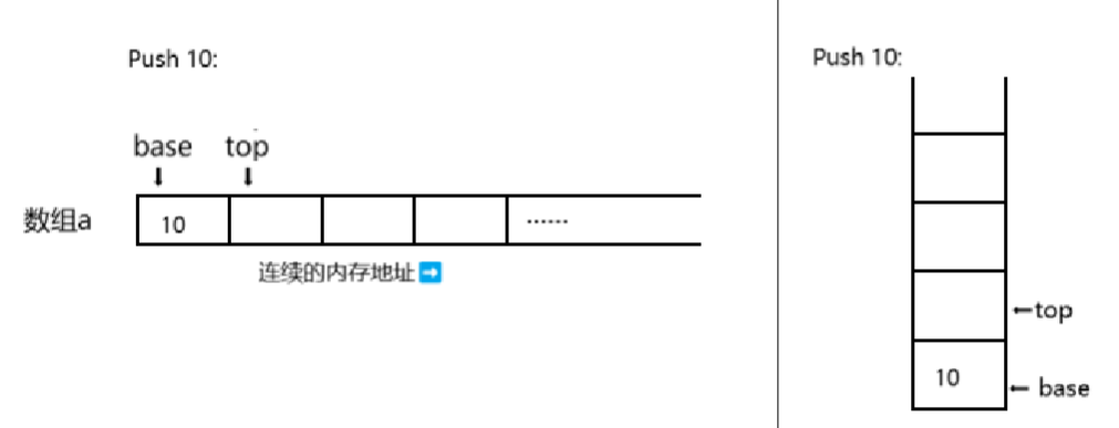 向栈中压入元素 10,base指向栈底,给当前top存入10,top++使指针向后移动,如下图所示
