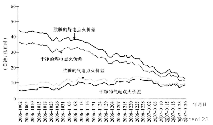 注:图中“干净的”表示包含碳排放成本;“航脏的”表示不包含碳排放成本。合约月份是2007年2月。