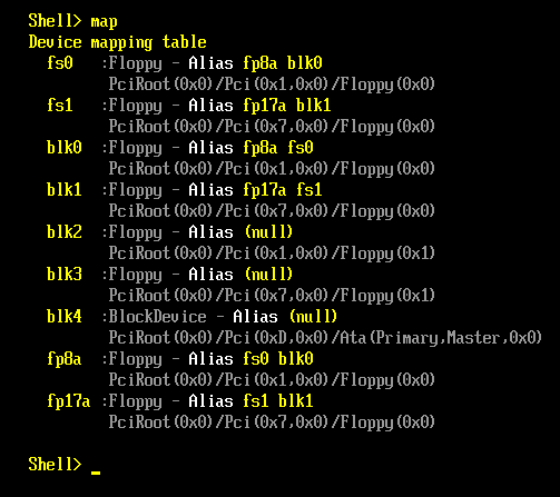 使用UEFI shell指令中的map打印出来Maping Table只有BLK0、BLK1......
